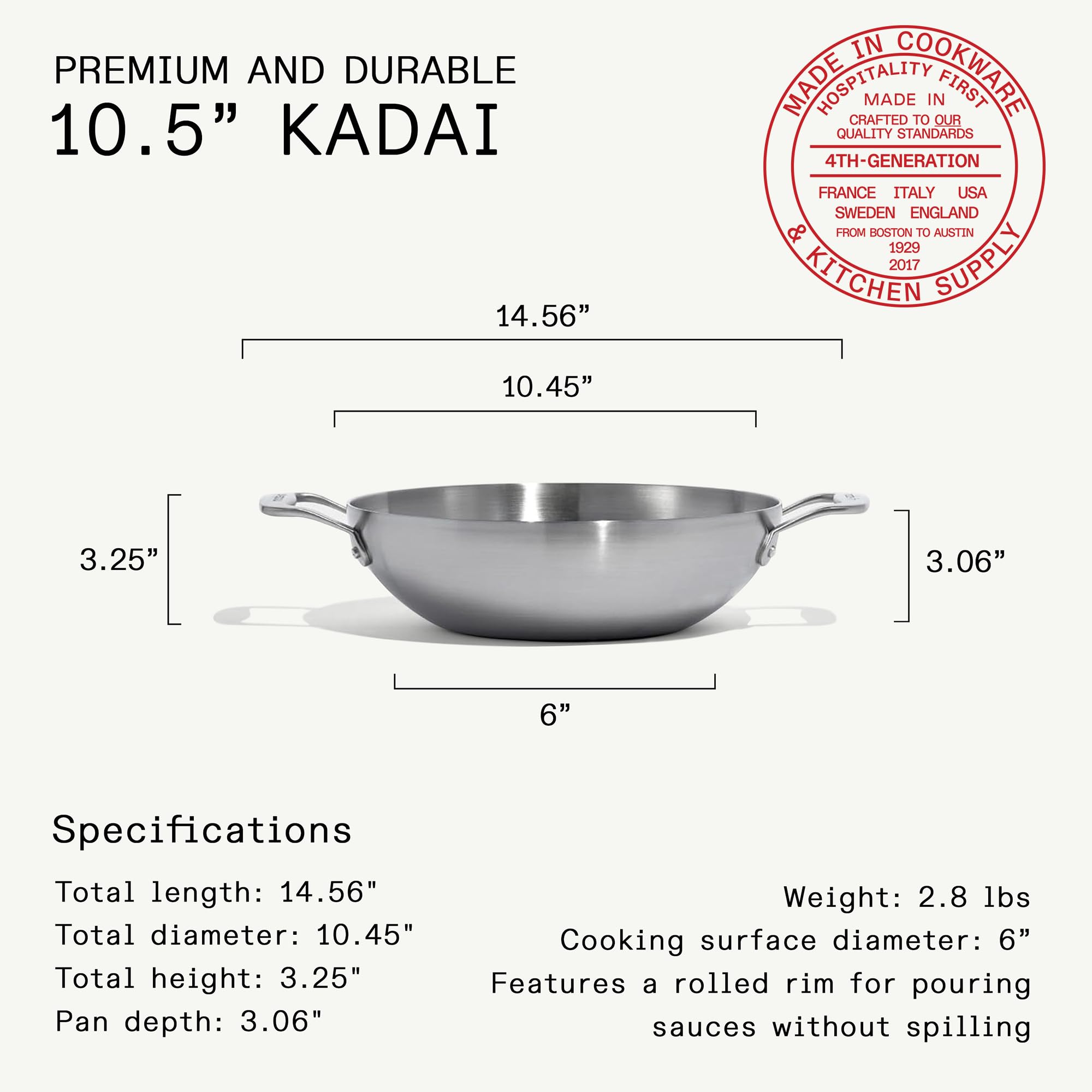 - Versatile Cooking Experience - The Made In Stainless Clad Kadai features a wide bowl and sloping sides clad from 5 layers of metal, ensuring even and quick heating for sautéing, stir-frying, or deep-frying
