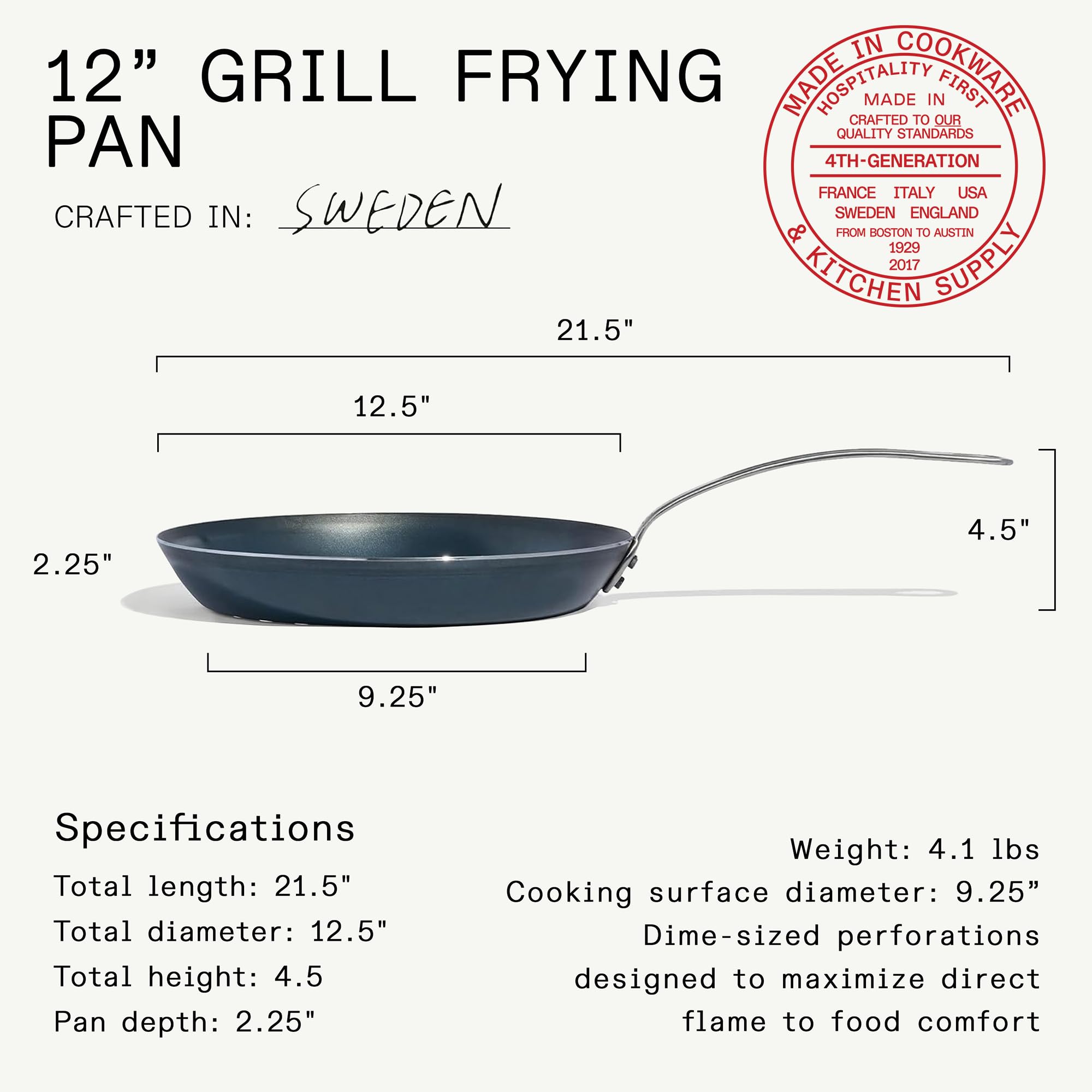 - Total Diameter: 12.5" | Cooking surface diameter: 9.25 inches | Height (with handle): 4.5” | Depth: 2.25” | Length (including handle): 21.5”