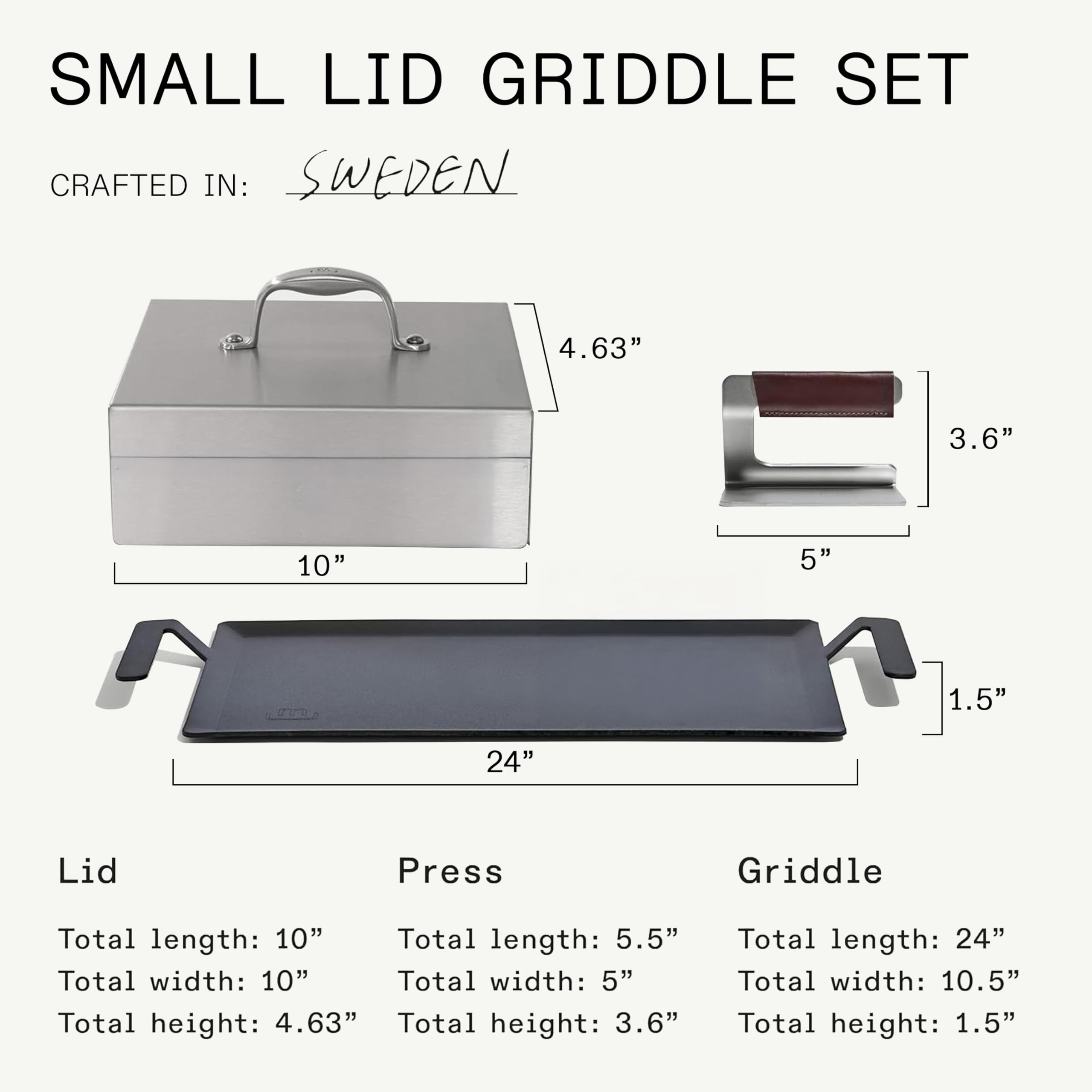 - Includes: 19.5"L x 10.5"W Carbon Steel Griddle | 5.5"L x 5"W Grill Press | 8.63"L x 8.63"W Lid