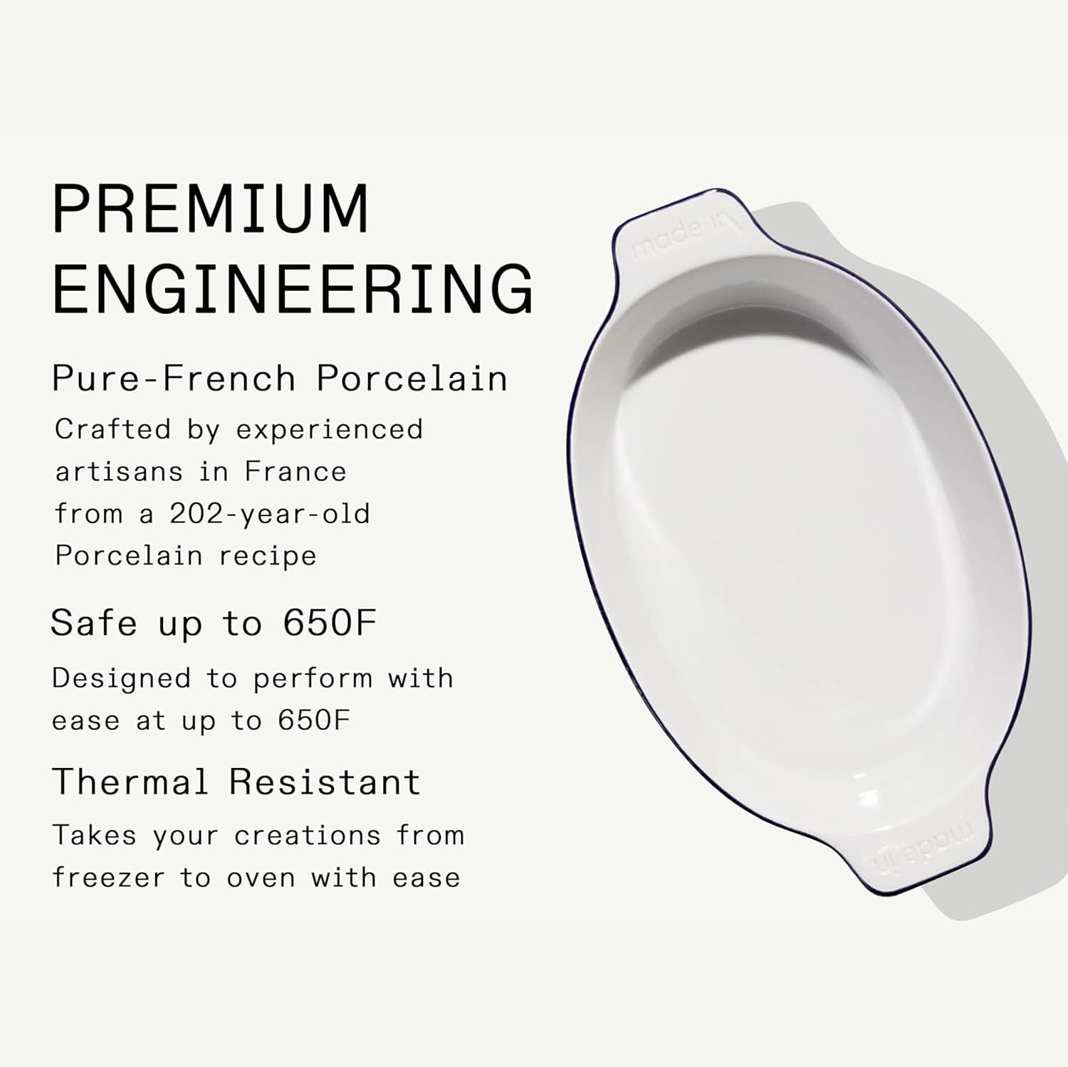 - Pure French Porcelain - Crafted in France from a 202-year-old Porcelain recipe, the Made In Oval Baking Dish looks as good as it performs